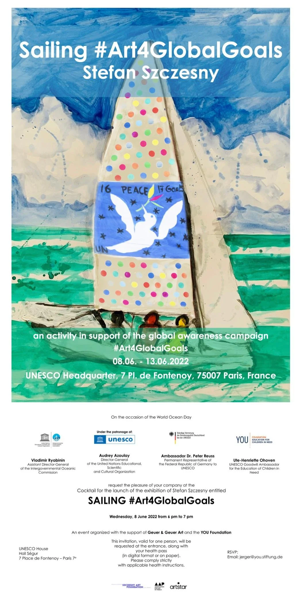 Du 8 au 13 juin 2022, l’exposition Sailing #Art4GlobalGoals de l’artiste Stefan Szczesny a été présentée au siège de l’UNESCO à Paris, à l’occasion de la Journée mondiale des océans. À travers 17 voiles peintes, l’artiste a interprété les 17 Objectifs de développement durable des Nations Unies. La Fondation Szczesny était partenaire de cette exposition, soutenue par l’UNESCO dans le cadre de la campagne internationale #Art4GlobalGoals.